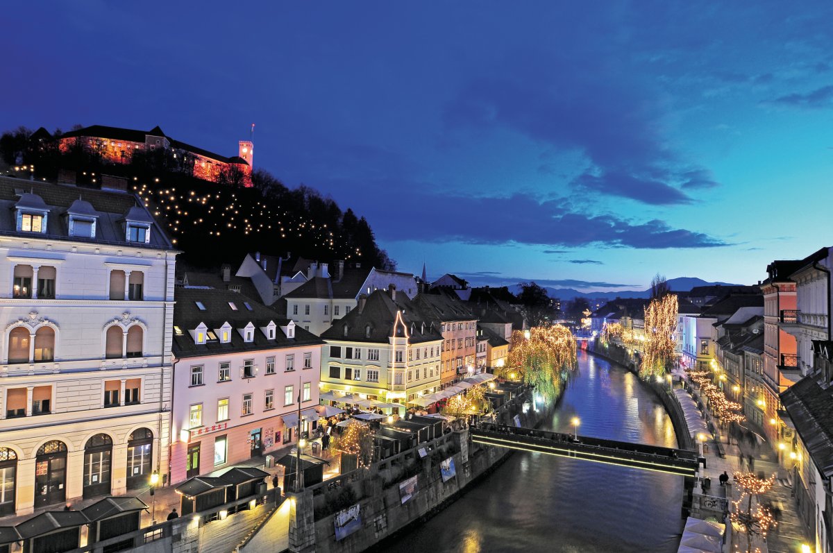 Geführter Rundgang durch die Altstadt mit Plecniks Bauten, Franziskanerkirche und Drachenbrücke. Rund um die „Drei Brücken“ entfaltet sich ein funkelndes Lichtermeer mit einem stimmungsvollen Weihnachtsmarkt. Am Abend Spaziergang entlang der festlich beleuchteten Ljubljanica.