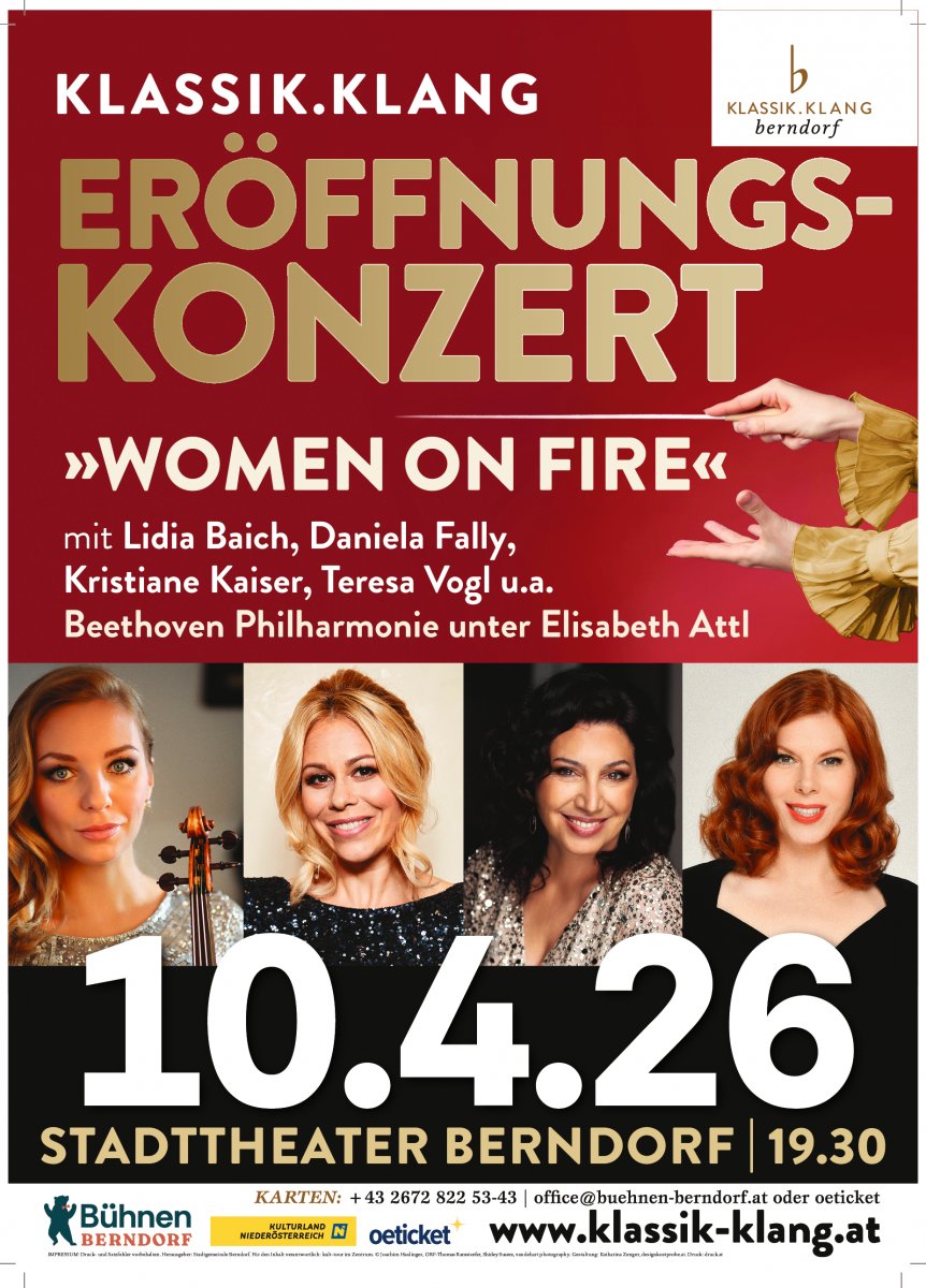Der KLASSIK.KLANG berndorf 2026 steht ganz im Zeichen des „FRAU.SEINs“! Im Eröffnungskonzert tauchen wir ein in die Schicksale bekannter weiblicher Protagonistinnen. Freuen Sie sich auf Star-Violinistin Lidia Baich, KS Kristiane Kaiser, die Staatsopern-Mezzosopranistin Monika Bohinec, die Gewinnerin von Elina Garancas „Zukunftsstimmen“ Maja Triler und die künstlerische Leiterin des KLASSIK.KLANG berndorf KS Daniela Fally. ORF-Kulturlady Teresa Vogl führt durch den Abend.