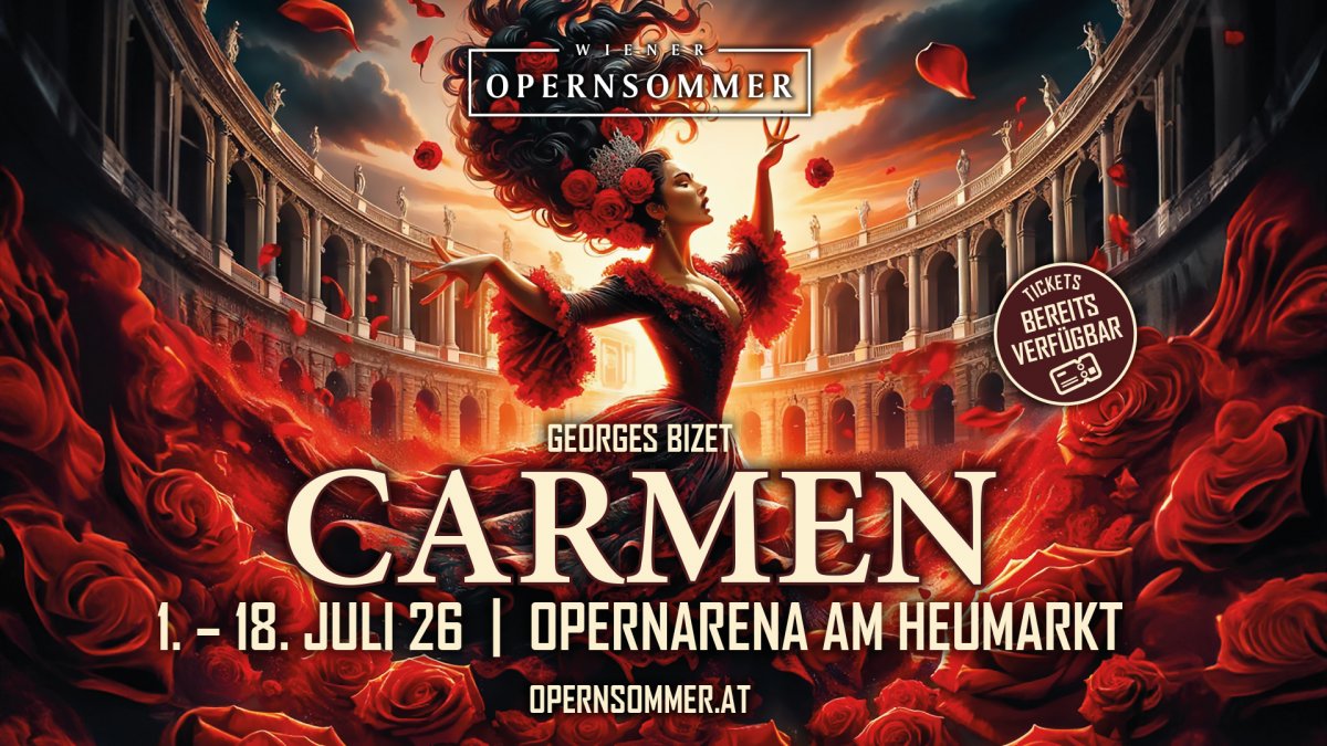 Ein Fest voller spanischem Temperament und musikalischer Leidenschaft erwartet Sie in der stimmungsvollen Open-Air-Arena am Wiener Heumarkt mit Georges Bizets Meisterwerk „Carmen“, einer Oper voller mitreißender Melodien, brennender Emotionen und großer Leidenschaft. Freuen Sie sich auf eine hochkarätige Inszenierung mit internationaler Starbesetzung und dem Wiener KammerOrchester, die die zeitlose Botschaft von Frieden, Mut und Menschlichkeit eindrucksvoll in Szene setzt. Zwischen Liebe und Eifersucht, Hoffnung und Verrat entfaltet sich ein fesselndes Drama, das in einem fatalen Finale mündet.