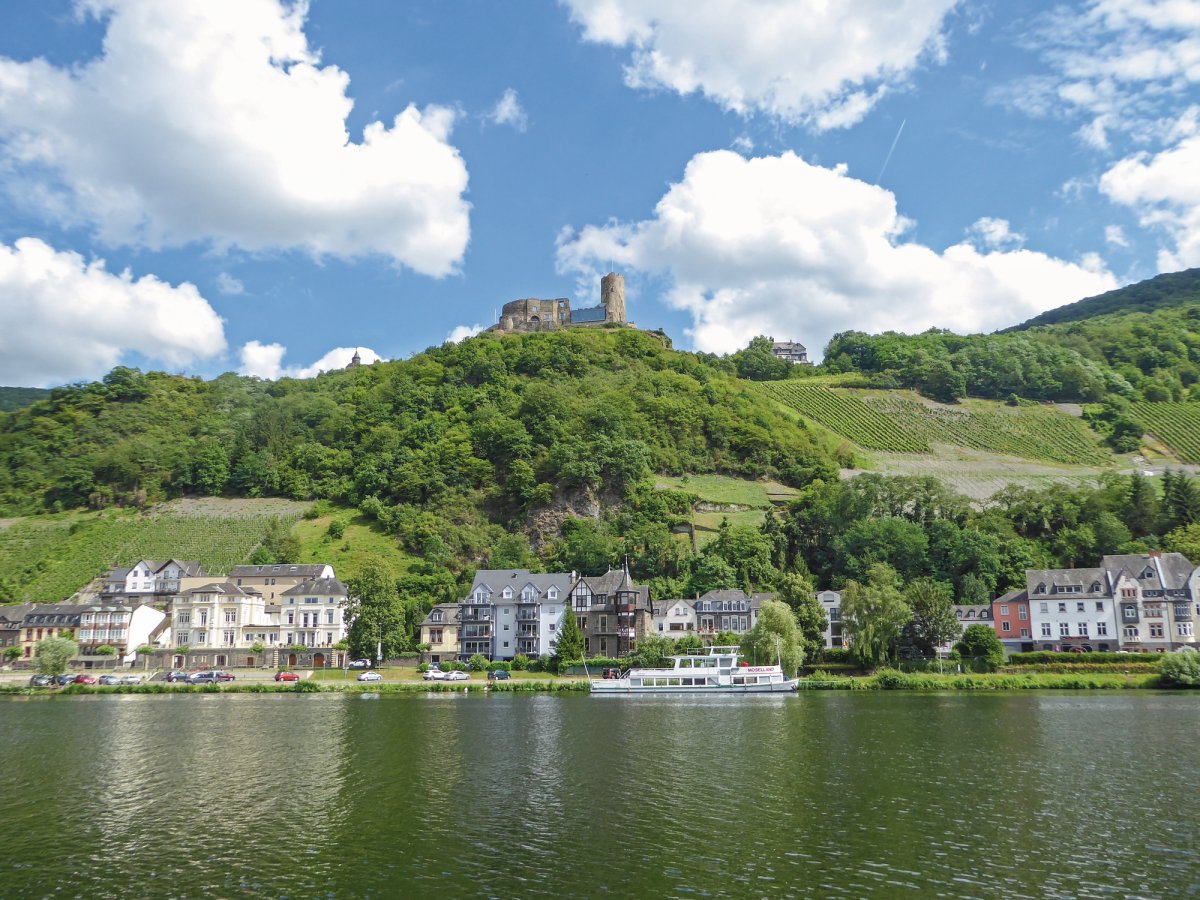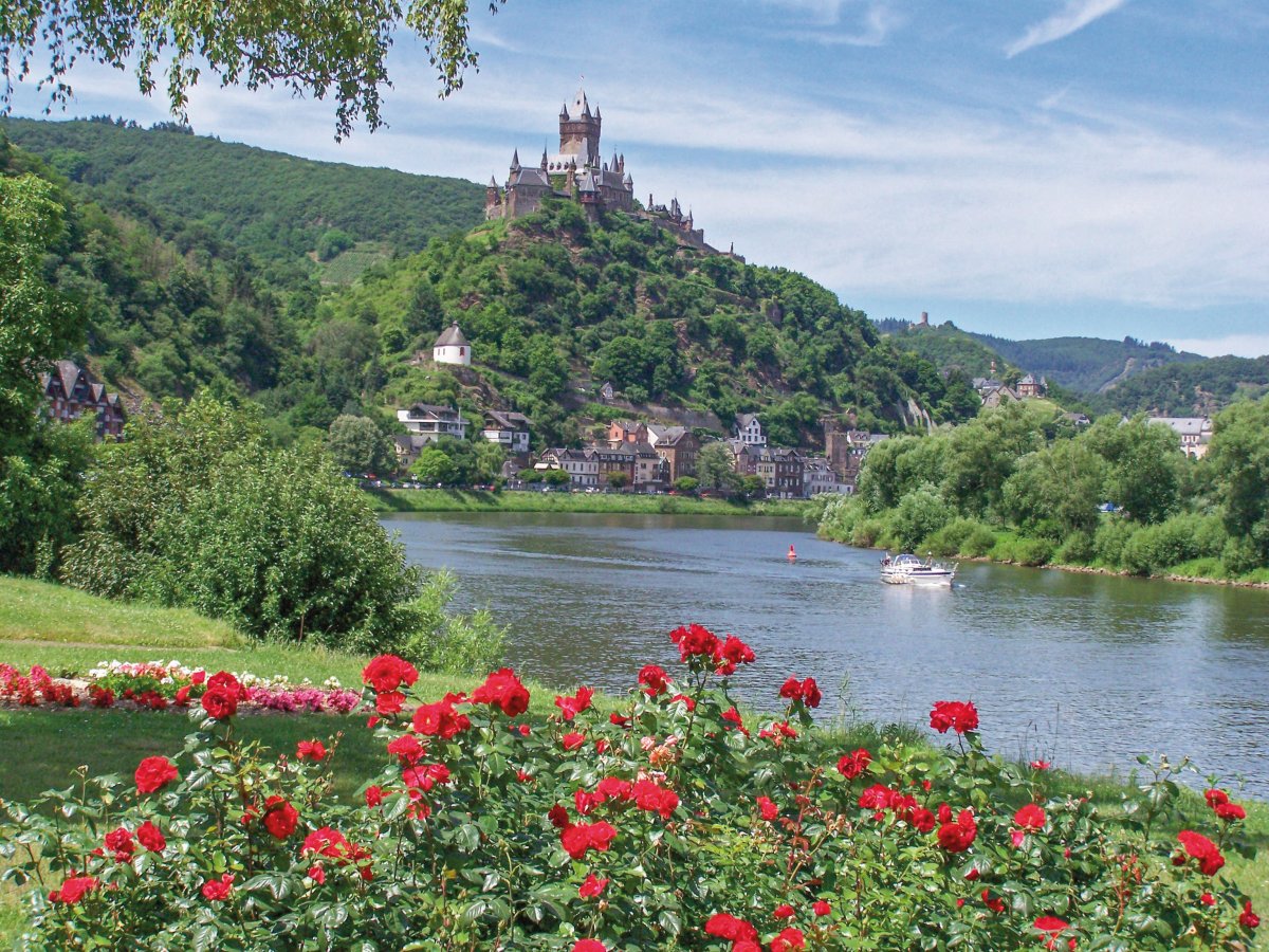 Von der weltberühmten Weinlage „Kröver Nacktarsch“ führt uns der Weg zu den Jugendstilvillen der Weinhändler nach Traben-Trarbach. Umgeben von steilen Weinhängen radeln wir durch die Moselschleifen und kleine Weindörfer mit Schmuckstücken der Fachwerkkunst. Am Etappenziel thront vor uns, wie eine Märchenburg, die Reichsburg Cochem.